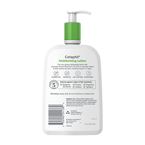 Details: Find skin care that works for you with CETAPHIL Moisturizing Lotion, a lightweight and fast absorbing moisturizer designed to comfort and hydrate all skin types. The unique formulation of skin essential vitamin E and 6 moisturizing ingredients provides instant lightweight hydration that leaves skin soft and smooth. And now formulated with a new blend of key ingredients: hydrating glycerin, panthenol (vitamin B5) to hydrate, soothe and preserve the skin barrier, and niacinamide (vitamin B3) to help smooth skin texture and retain skin moisture barrier. Water binding agents deeply replenish the skins moisture and prevent moisture loss, providing long lasting 48 hour hydration that completely restores the skins moisture barrier in one week, helping to defend against 5 signs of skin sensitivity. Fragrance free, lanolin free, paraben free and sulfate free, this gentle lotion is clinically tested for even the most sensitive skin. Treat your skin right thanks to the gentle, non-comedogenic formula, providing instant, everyday moisturizing care that leaves skin immediately feeling soft, smooth and replenished.